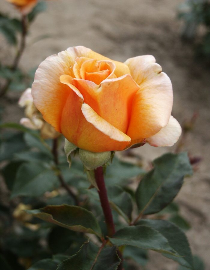 Velkokvětá růže ze skupiny čajohybridů. Keř vysoký 60-80 cm, květ oranžový, okraje plátků světlejší, krásné poupě.